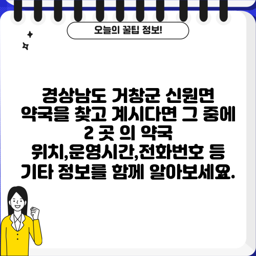 경상남도 거창군 신원면 약국을 찾고 계시다면 그 중에 2 곳 의 약국 위치,운영시간,전화번호 등 기타 정보를 함께 알아보세요.