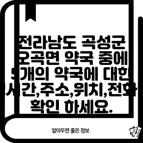 전라남도 곡성군 오곡면 약국 중에 5개의 약국에 대한 운영시간,주소,위치,전화번호 확인 하세요.