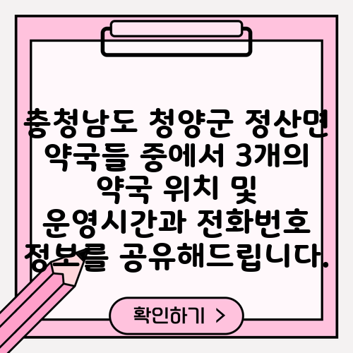 충청남도 청양군 정산면 약국들 중에서 3개의 약국 위치 및 운영시간과 전화번호 정보를 공유해드립니다.