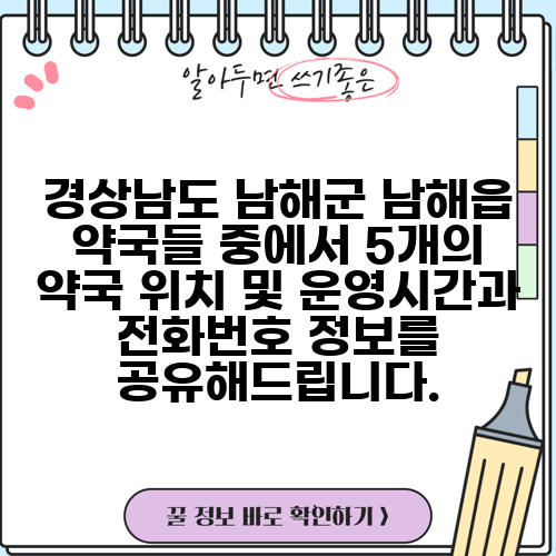 경상남도 남해군 남해읍 약국들 중에서 5개의 약국 위치 및 운영시간과 전화번호 정보를 공유해드립니다.