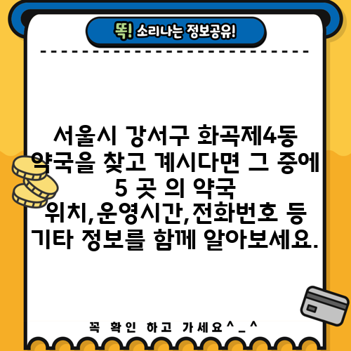서울시 강서구 화곡제4동 약국을 찾고 계시다면 그 중에 5 곳 의 약국 위치,운영시간,전화번호 등 기타 정보를 함께 알아보세요.