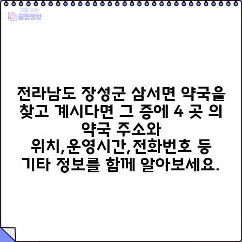 전라남도 장성군 삼서면 약국을 찾고 계시다면 그 중에 4 곳 의 약국 주소와 위치,운영시간,전화번호 등 기타 정보를 함께 알아보세요.
