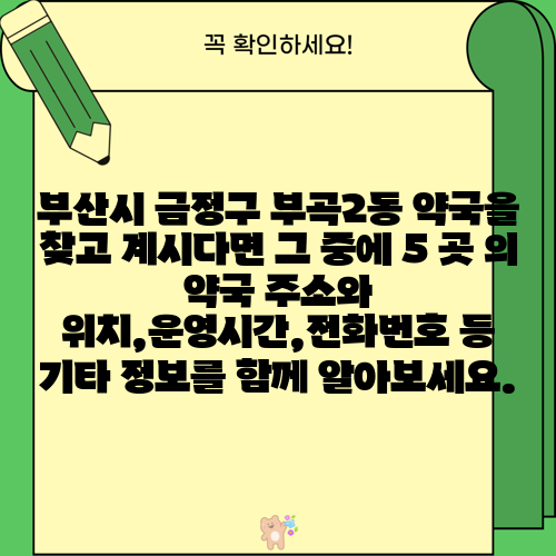 부산시 금정구 부곡2동 약국을 찾고 계시다면 그 중에 5 곳 의 약국 주소와 위치,운영시간,전화번호 등 기타 정보를 함께 알아보세요.
