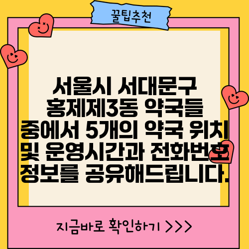 서울시 서대문구 홍제제3동 약국들 중에서 5개의 약국 위치 및 운영시간과 전화번호 정보를 공유해드립니다.