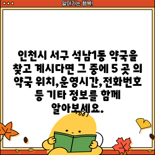 인천시 서구 석남1동 약국을 찾고 계시다면 그 중에 5 곳 의 약국 위치,운영시간,전화번호 등 기타 정보를 함께 알아보세요.