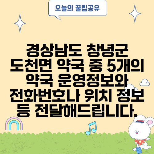 경상남도 창녕군 도천면 약국 중 5개의 약국 운영정보와 전화번호나 위치 정보 등 전달해드립니다.
