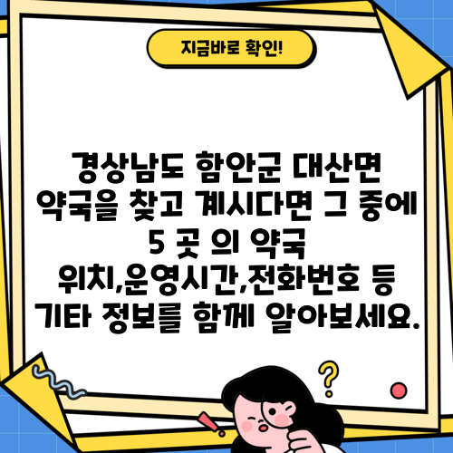 경상남도 함안군 대산면 약국을 찾고 계시다면 그 중에 5 곳 의 약국 위치,운영시간,전화번호 등 기타 정보를 함께 알아보세요.