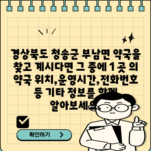 경상북도 청송군 부남면 약국을 찾고 계시다면 그 중에 1 곳 의 약국 위치,운영시간,전화번호 등 기타 정보를 함께 알아보세요.