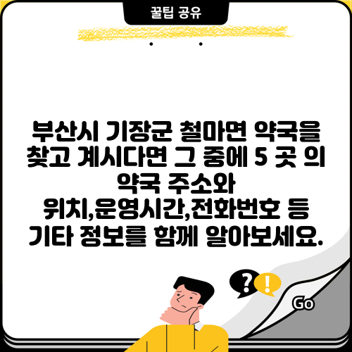 부산시 기장군 철마면 약국을 찾고 계시다면 그 중에 5 곳 의 약국 주소와 위치,운영시간,전화번호 등 기타 정보를 함께 알아보세요.