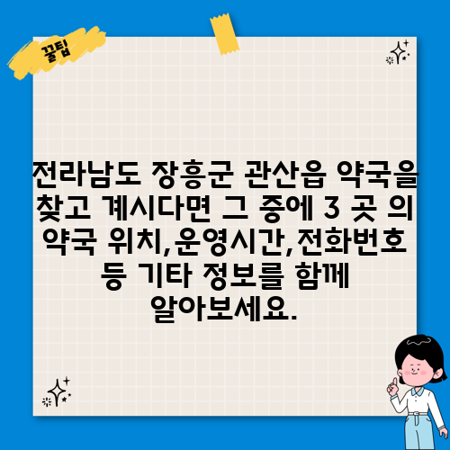 전라남도 장흥군 관산읍 약국을 찾고 계시다면 그 중에 3 곳 의 약국 위치,운영시간,전화번호 등 기타 정보를 함께 알아보세요.