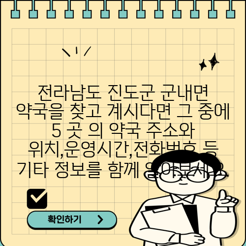 전라남도 진도군 군내면 약국을 찾고 계시다면 그 중에 5 곳 의 약국 주소와 위치,운영시간,전화번호 등 기타 정보를 함께 알아보세요.
