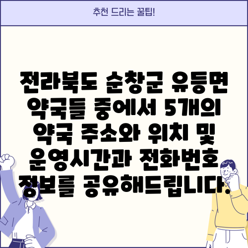 전라북도 순창군 유등면 약국들 중에서 5개의 약국 주소와 위치 및 운영시간과 전화번호 정보를 공유해드립니다.
