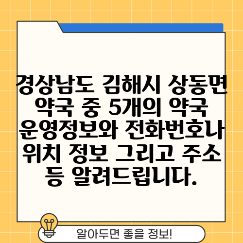 경상남도 김해시 상동면 약국 중 5개의 약국 운영정보와 전화번호나 위치 정보 그리고 주소 등 알려드립니다.