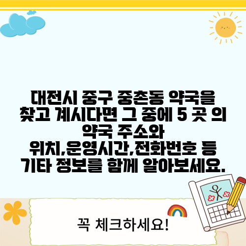 대전시 중구 중촌동 약국을 찾고 계시다면 그 중에 5 곳 의 약국 주소와 위치,운영시간,전화번호 등 기타 정보를 함께 알아보세요.