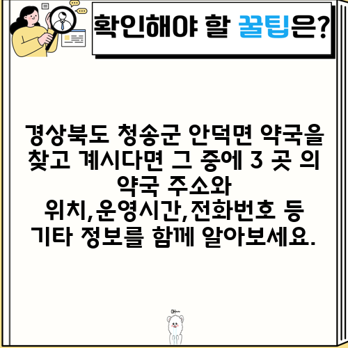 경상북도 청송군 안덕면 약국을 찾고 계시다면 그 중에 3 곳 의 약국 주소와 위치,운영시간,전화번호 등 기타 정보를 함께 알아보세요.