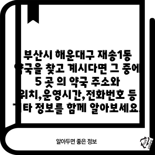 부산시 해운대구 재송1동 약국을 찾고 계시다면 그 중에 5 곳 의 약국 주소와 위치,운영시간,전화번호 등 기타 정보를 함께 알아보세요.