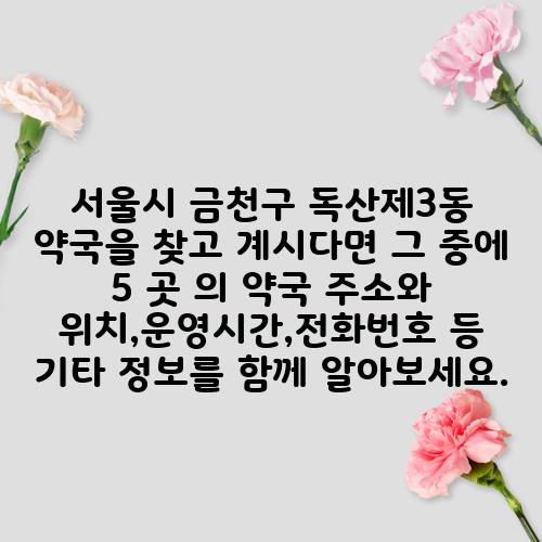 서울시 금천구 독산제3동 약국을 찾고 계시다면 그 중에 5 곳 의 약국 주소와 위치,운영시간,전화번호 등 기타 정보를 함께 알아보세요.