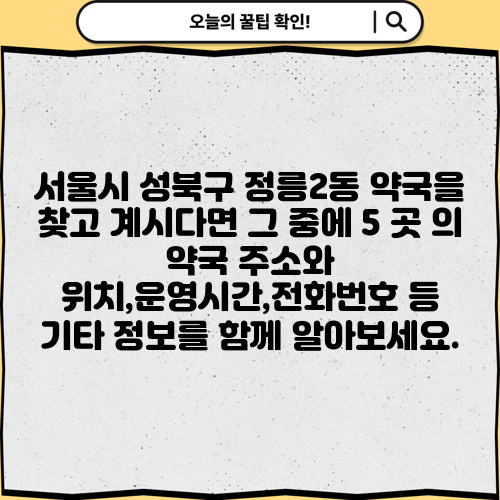 서울시 성북구 정릉2동 약국을 찾고 계시다면 그 중에 5 곳 의 약국 주소와 위치,운영시간,전화번호 등 기타 정보를 함께 알아보세요.