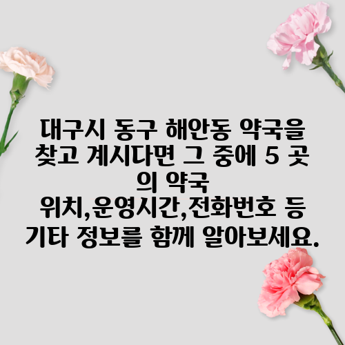 대구시 동구 해안동 약국을 찾고 계시다면 그 중에 5 곳 의 약국 위치,운영시간,전화번호 등 기타 정보를 함께 알아보세요.