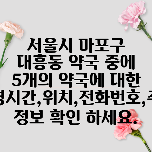 서울시 마포구 대흥동 약국 중에 5개의 약국에 대한 운영시간,위치,전화번호,주소 정보 확인 하세요.