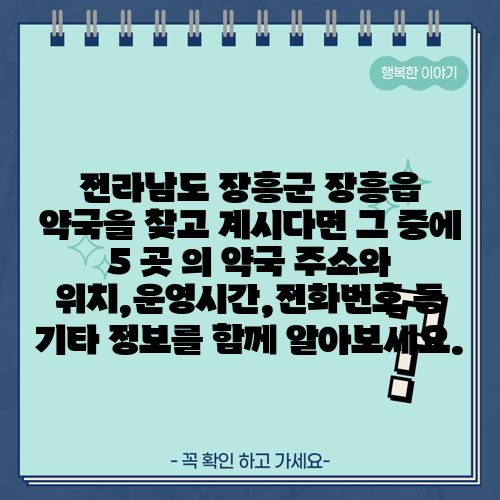 전라남도 장흥군 장흥읍 약국을 찾고 계시다면 그 중에 5 곳 의 약국 주소와 위치,운영시간,전화번호 등 기타 정보를 함께 알아보세요.