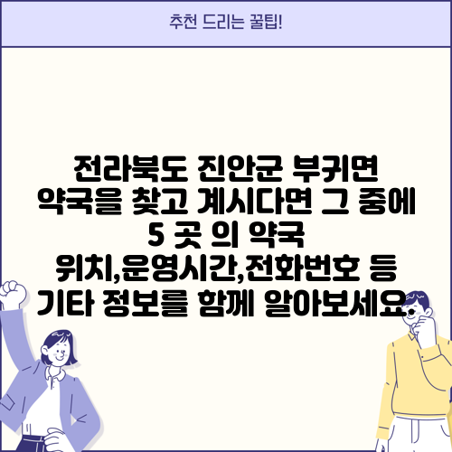 전라북도 진안군 부귀면 약국을 찾고 계시다면 그 중에 5 곳 의 약국 위치,운영시간,전화번호 등 기타 정보를 함께 알아보세요.