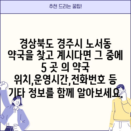 경상북도 경주시 노서동 약국을 찾고 계시다면 그 중에 5 곳 의 약국 위치,운영시간,전화번호 등 기타 정보를 함께 알아보세요.