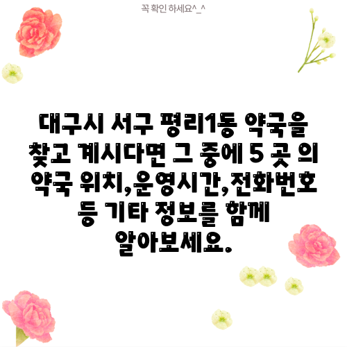 대구시 서구 평리1동 약국을 찾고 계시다면 그 중에 5 곳 의 약국 위치,운영시간,전화번호 등 기타 정보를 함께 알아보세요.