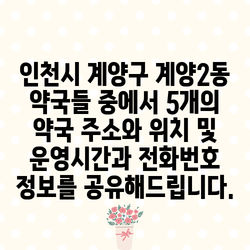 인천시 계양구 계양2동 약국들 중에서 5개의 약국 주소와 위치 및 운영시간과 전화번호 정보를 공유해드립니다.