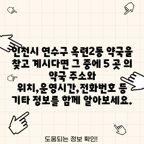 인천시 연수구 옥련2동 약국을 찾고 계시다면 그 중에 5 곳 의 약국 주소와 위치,운영시간,전화번호 등 기타 정보를 함께 알아보세요.