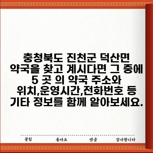 충청북도 진천군 덕산면 약국을 찾고 계시다면 그 중에 5 곳 의 약국 주소와 위치,운영시간,전화번호 등 기타 정보를 함께 알아보세요.