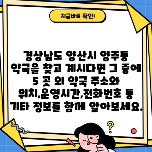 경상남도 양산시 양주동 약국을 찾고 계시다면 그 중에 5 곳 의 약국 주소와 위치,운영시간,전화번호 등 기타 정보를 함께 알아보세요.