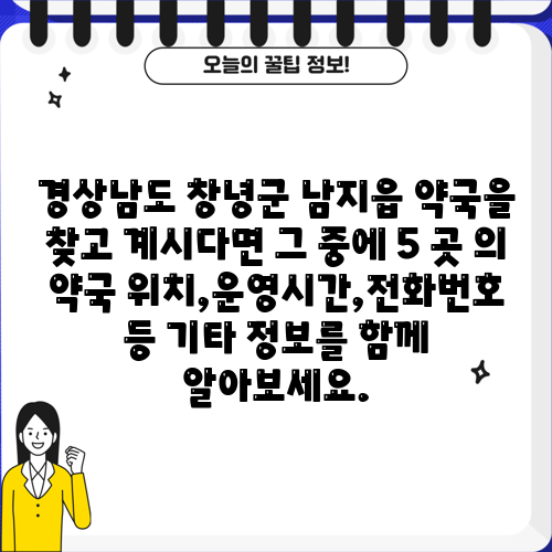 경상남도 창녕군 남지읍 약국을 찾고 계시다면 그 중에 5 곳 의 약국 위치,운영시간,전화번호 등 기타 정보를 함께 알아보세요.