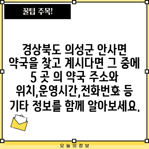 경상북도 의성군 안사면 약국을 찾고 계시다면 그 중에 5 곳 의 약국 주소와 위치,운영시간,전화번호 등 기타 정보를 함께 알아보세요.