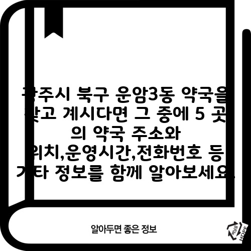 1. 운암약국 정보 1. 운암약국 운영시간 및 위치, 전화번호 확인하세요! 주소: 광주 북구 북문대로 101 운암약국 운영 시간: 정보 없음 ...