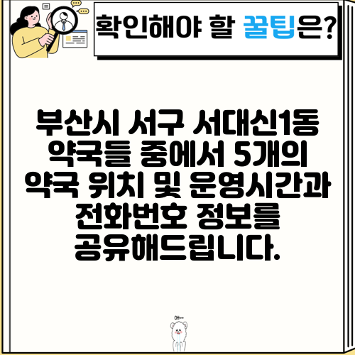 부산시 서구 서대신1동 약국들 중에서 5개의 약국 위치 및 운영시간과 전화번호 정보를 공유해드립니다.