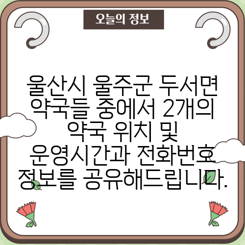 울산시 울주군 두서면 약국들 중에서 2개의 약국 위치 및 운영시간과 전화번호 정보를 공유해드립니다.