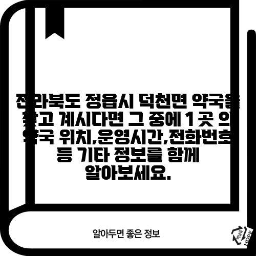 전라북도 정읍시 덕천면 약국을 찾고 계시다면 그 중에 1 곳 의 약국 위치,운영시간,전화번호 등 기타 정보를 함께 알아보세요.