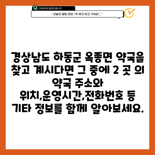 경상남도 하동군 옥종면 약국을 찾고 계시다면 그 중에 2 곳 의 약국 주소와 위치,운영시간,전화번호 등 기타 정보를 함께 알아보세요.