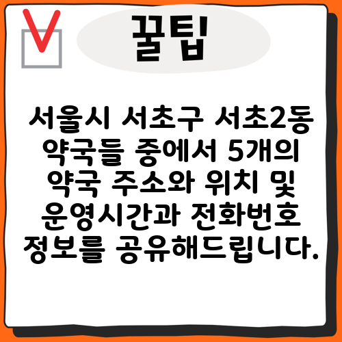서울시 서초구 서초2동 약국들 중에서 5개의 약국 주소와 위치 및 운영시간과 전화번호 정보를 공유해드립니다.
