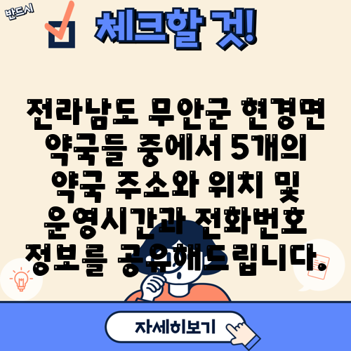 전라남도 무안군 현경면 약국들 중에서 5개의 약국 주소와 위치 및 운영시간과 전화번호 정보를 공유해드립니다.