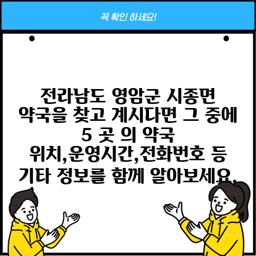 전라남도 영암군 시종면 약국을 찾고 계시다면 그 중에 5 곳 의 약국 위치,운영시간,전화번호 등 기타 정보를 함께 알아보세요.