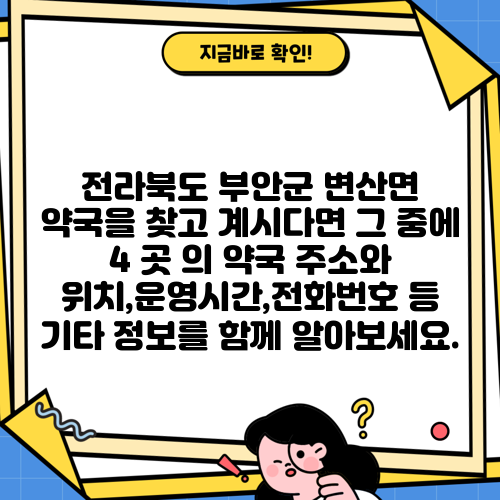 전라북도 부안군 변산면 약국을 찾고 계시다면 그 중에 4 곳 의 약국 주소와 위치,운영시간,전화번호 등 기타 정보를 함께 알아보세요.