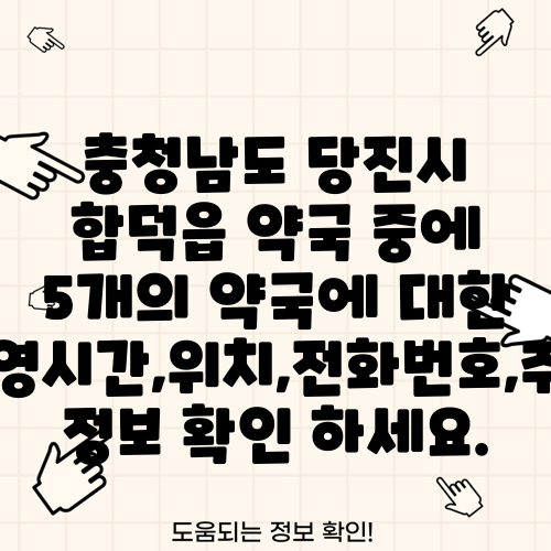 충청남도 당진시 합덕읍 약국 중에 5개의 약국에 대한 운영시간,위치,전화번호,주소 정보 확인 하세요.