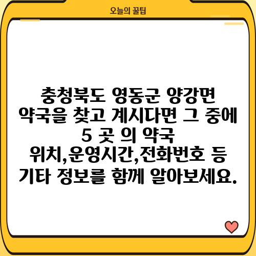 충청북도 영동군 양강면 약국을 찾고 계시다면 그 중에 5 곳 의 약국 위치,운영시간,전화번호 등 기타 정보를 함께 알아보세요.