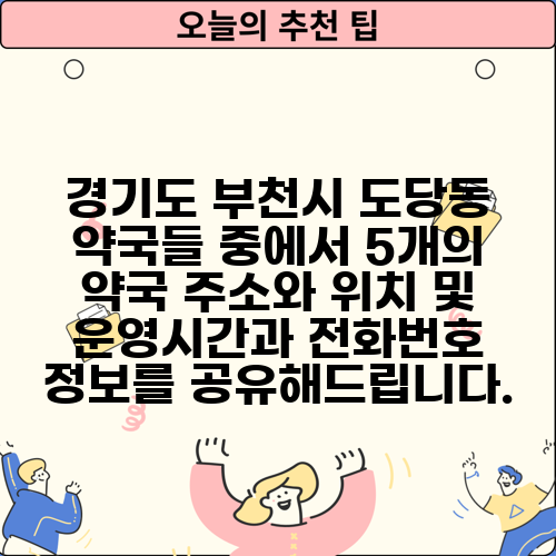 경기도 부천시 도당동 약국들 중에서 5개의 약국 주소와 위치 및 운영시간과 전화번호 정보를 공유해드립니다.