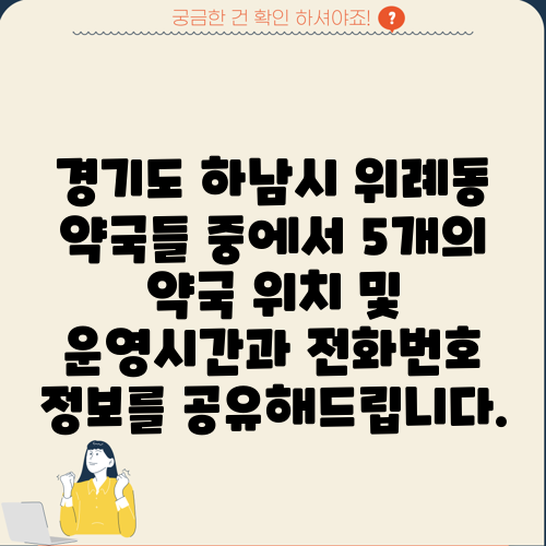 경기도 하남시 위례동 약국들 중에서 5개의 약국 위치 및 운영시간과 전화번호 정보를 공유해드립니다.