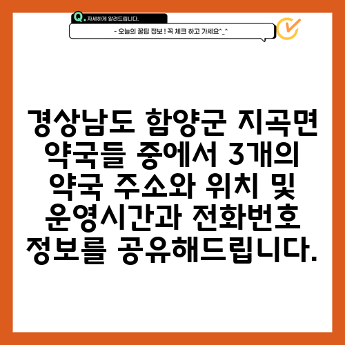 경상남도 함양군 지곡면 약국들 중에서 3개의 약국 주소와 위치 및 운영시간과 전화번호 정보를 공유해드립니다.