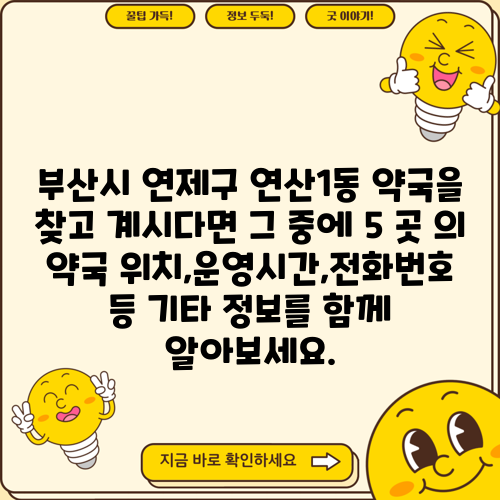 부산시 연제구 연산1동 약국을 찾고 계시다면 그 중에 5 곳 의 약국 위치,운영시간,전화번호 등 기타 정보를 함께 알아보세요.