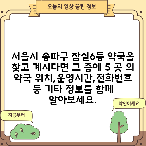 서울시 송파구 잠실6동 약국을 찾고 계시다면 그 중에 5 곳 의 약국 위치,운영시간,전화번호 등 기타 정보를 함께 알아보세요.